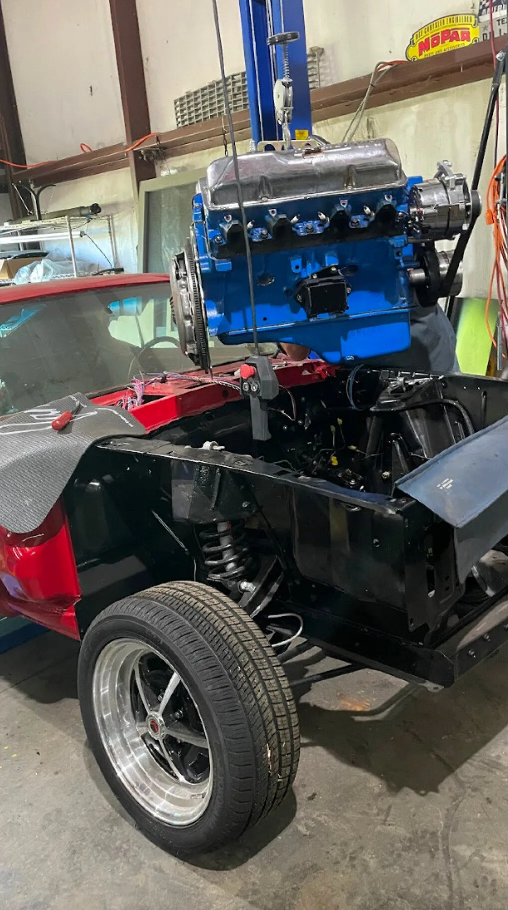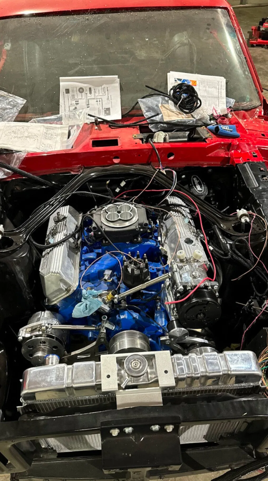 We stripped her to bare metal, dropped her on a rotisserie, and quickly realized we had a lot more rust than expected. Wyatt went to work welding in new metal throughout. Doors, fenders, trunk lid—all replaced or rebuilt. And after a long search, we finally tracked down a real 428 Cobra Jet in Alabama. Piece by piece, we rebuilt Ruby from the ground up.